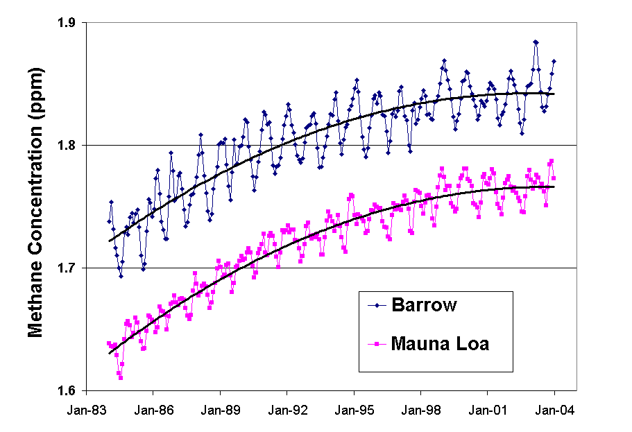 - Figure 18.10 : Time series of atmospheric methane (data from CMDL, http://www.cmdl.noaa.gov/ccgg/iadv/)