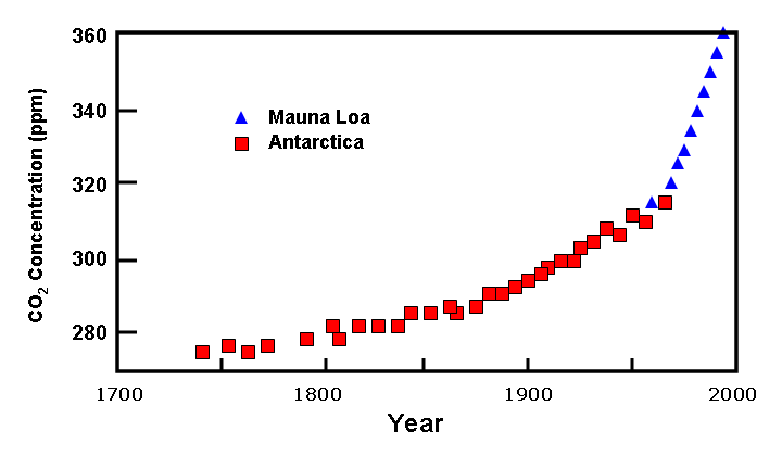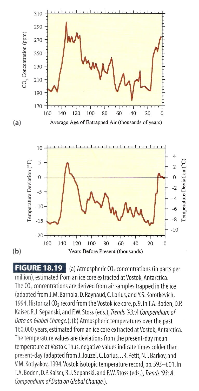 - Figure 18.19 : Atmospheric carbon dioxide concentrations and average air temperatures, derived from Vostok ice core (data from Trends '93: A Compendium of Data on Global Change)