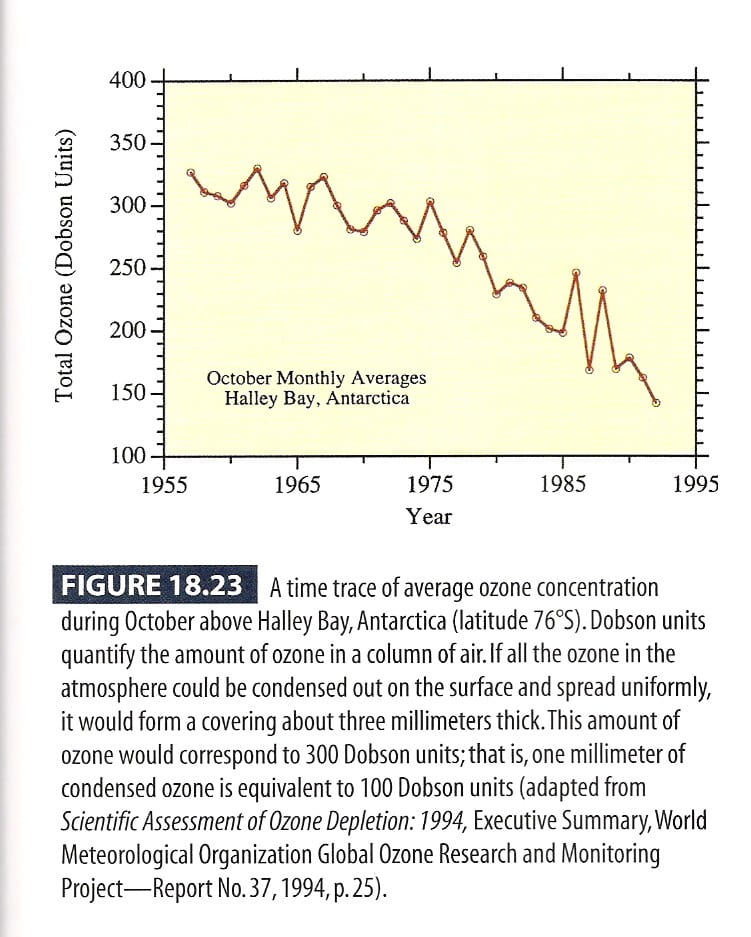 - Figure 18.23 : Trend in October average ozone over Halley Bay, Antarctic (data from Scientific Assessment of Ozone Depletion: 1994)