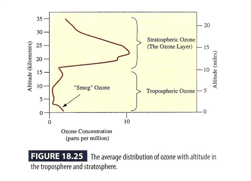 - Figure 18.25 : Average distribution of ozone with altitude in the troposphere and stratosphere
