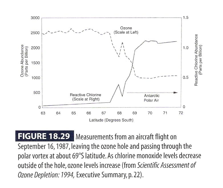 - Figure 18.29 : Measurements of ozone and chlorine monoxide inside and outside the ozone hole (data from Scientific Assessment of Ozone Depletion: 1994)